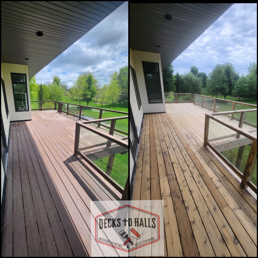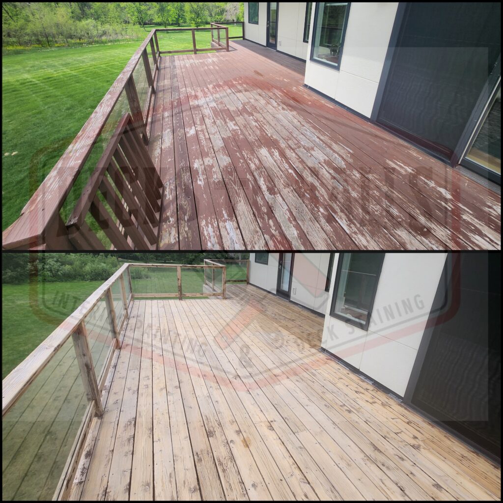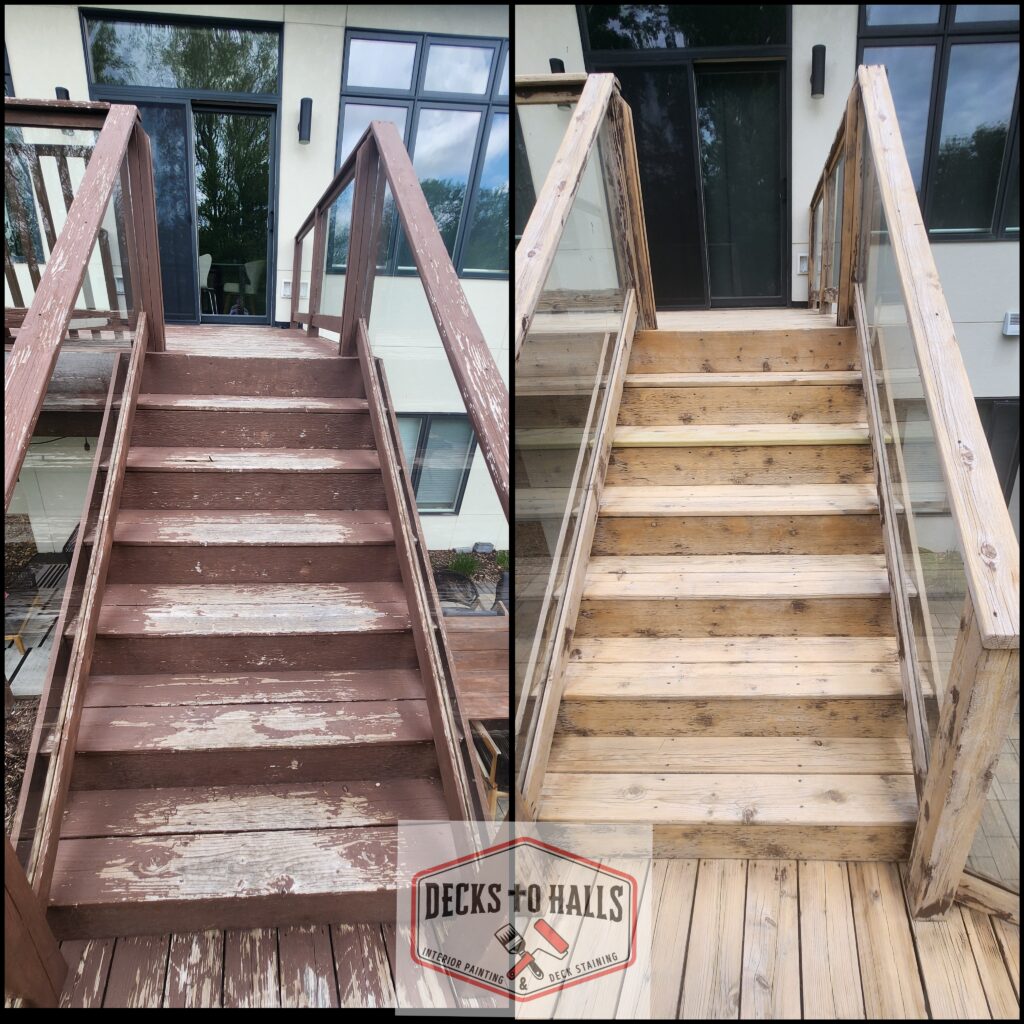 We strip the deck floor to the best of our ability—often comparing it to tattoo removal. It can be significantly improved, but it will never look like the stain was never there. After stripping, we thoroughly sand the surface and apply a penetrating oil-based stain to the floor. For the railings, spindles, and support posts, we use a water-based stain for a clean look and easier upkeep going forward.
